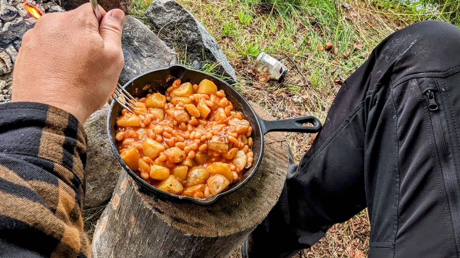 Die gusseiserne Pfanne ist das meistgenutzte Küchenutensil, vor allem am und im Feuer. Darauf werden Frühstück, Mittag, Abendessen und sämtliche Zwischenmahlzeiten zubereitet. Mehr braucht man eigentlich nicht.