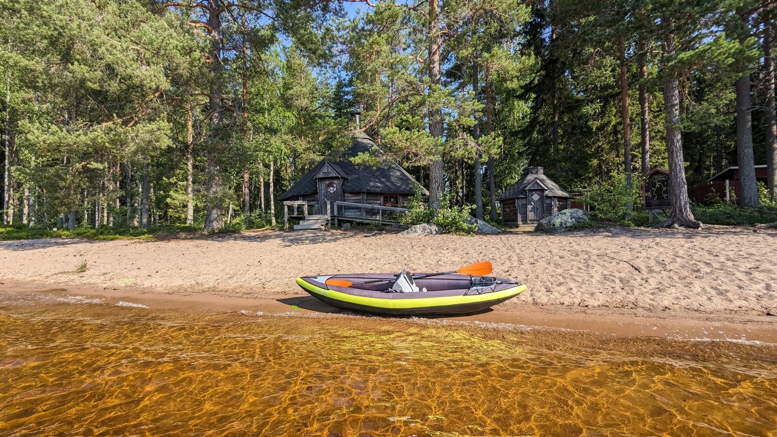 Aber zurück zum Haus: Es steht am Wasser, vielleicht 5 Meter vom Ufer entfernt, eingemottet in alten Baumbestand, der es komplett zu schlucken scheint. Der See ist nicht sonderlich groß und man blickt mit Leichtigkeit auf die gegenüberliegende Seite. Dafür ist er etwas länger, circa 6-7km; und beinahe komplett naturbelassen. Das Wasser ist durchsichtig und man kann in Ufernähe bis zum Boden schauen, wenn die Sonne scheint.